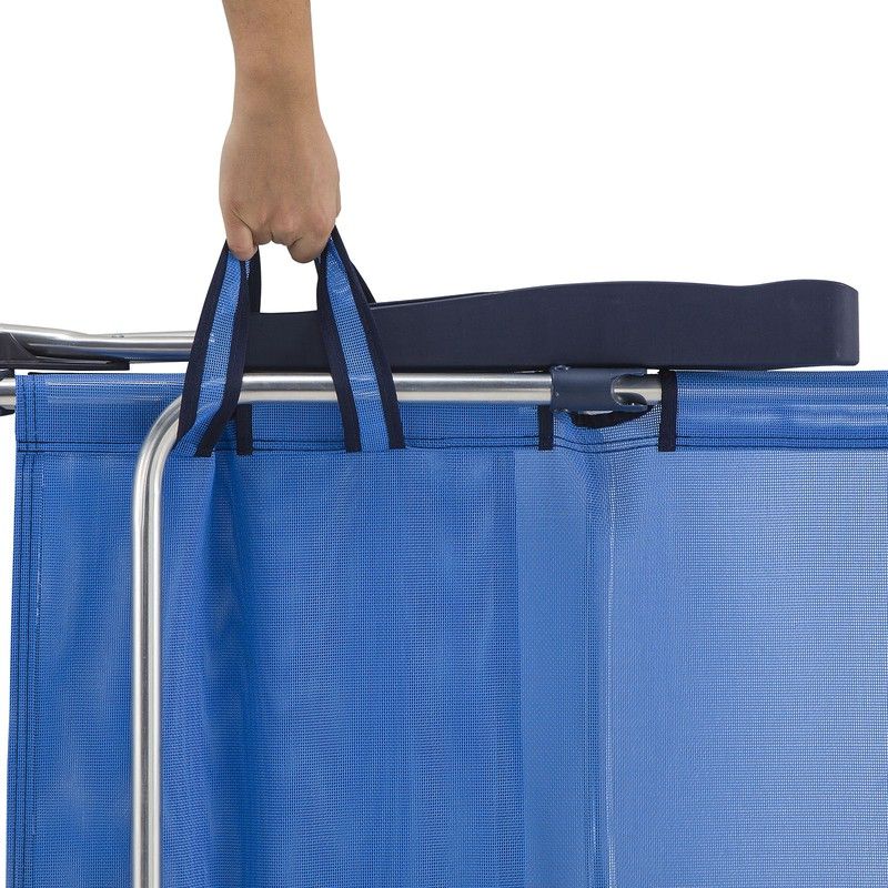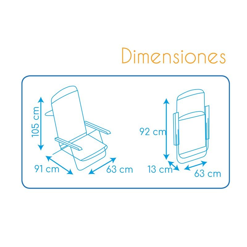 As costas desta cadeira de praia podem ser colocadas em 4 posições diferentes para o seu conforto; neste último, a cadeira é quase horizontal. Como a altura do assento é maior do que em cadeiras normais, é muito mais confortável sentar e levantar. Seu encosto alto cobre melhor as costas tornando-o mais confortável. A perna de apoio do encosto no chão é dobrável para que o produto ocupe menos espaço ao ser dobrado. É feito de um tubo redondo de alumínio leve com alças para que você possa levá-lo facilmente para a praia ou piscina. O tecido textilene é um tecido confortável e flexível, permite a transpiração e seca rapidamente; portanto, pode ser deixado de fora. É um produto dobrável. Também possui pés estabilizadores para maior estabilidade.